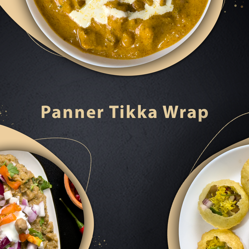 Chunks of spiced paneer wrapped in warm flatbread with fresh salad and sauce. (G, D)